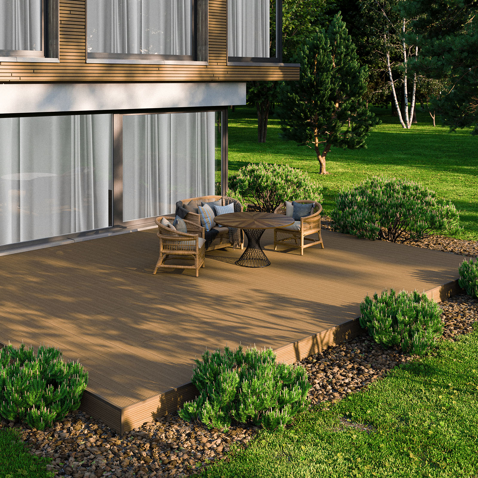A két oldalon különböző struktúrájú, megfordítható lapok csúszásgátló, időjárásnak és gombáknak ellenálló felülete nem igényel speciális felületkezelést, megjelenése pedig tökéletesen visszaadja a valódi fa hatását.